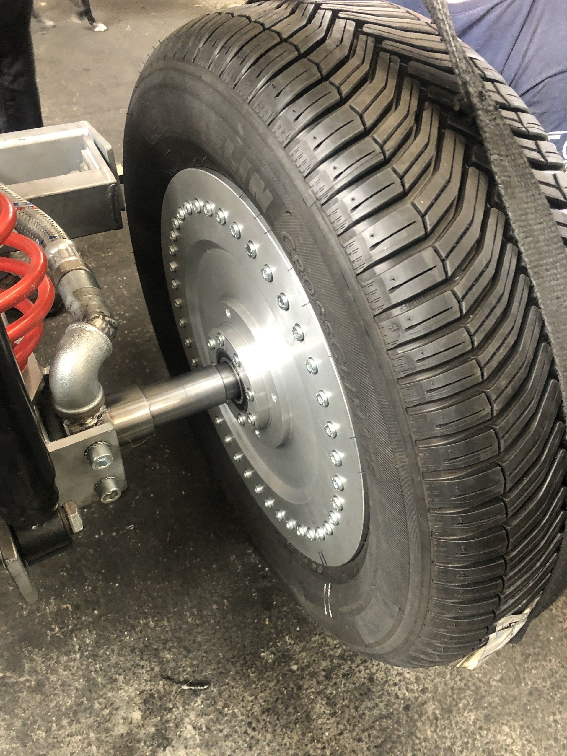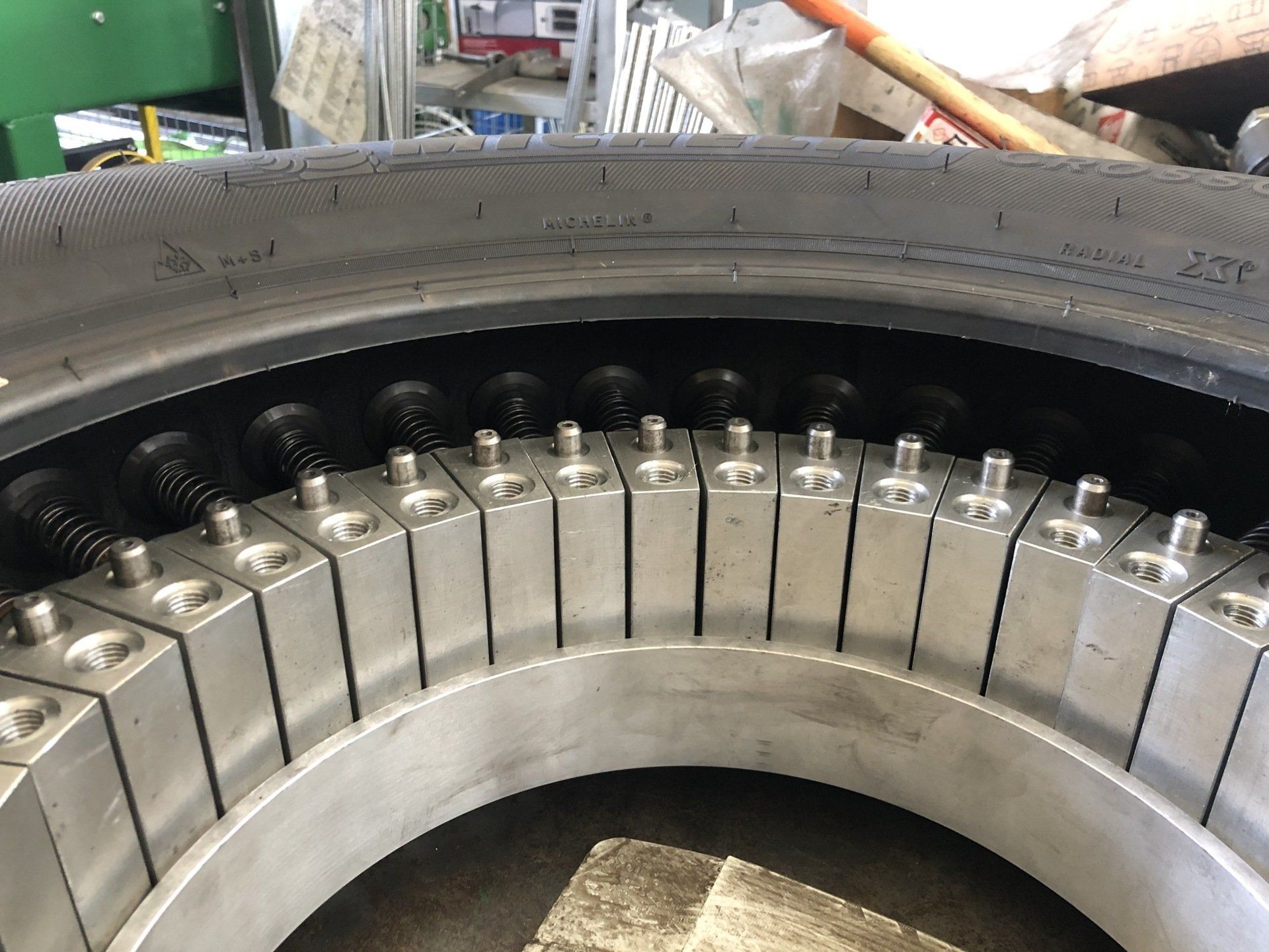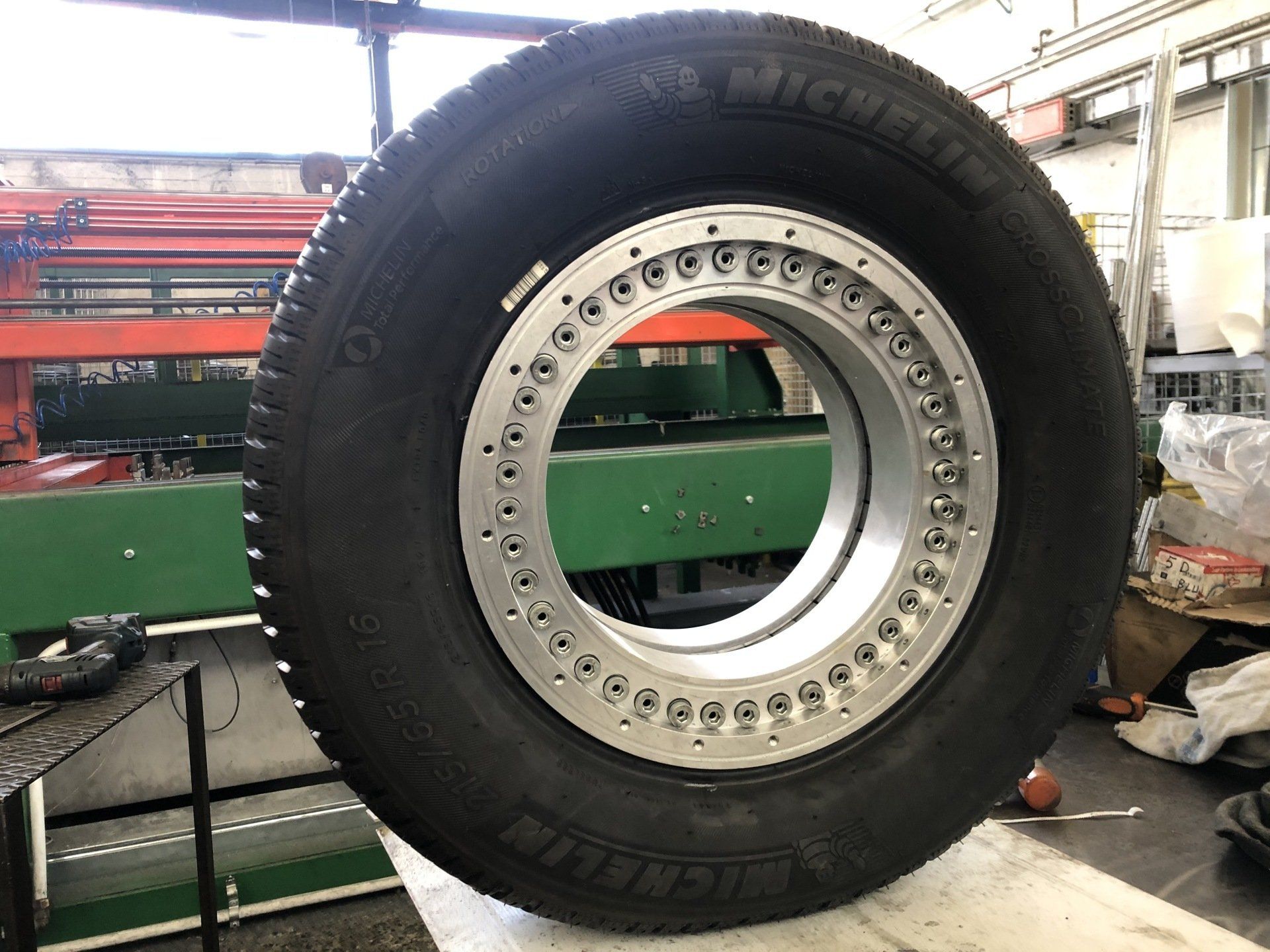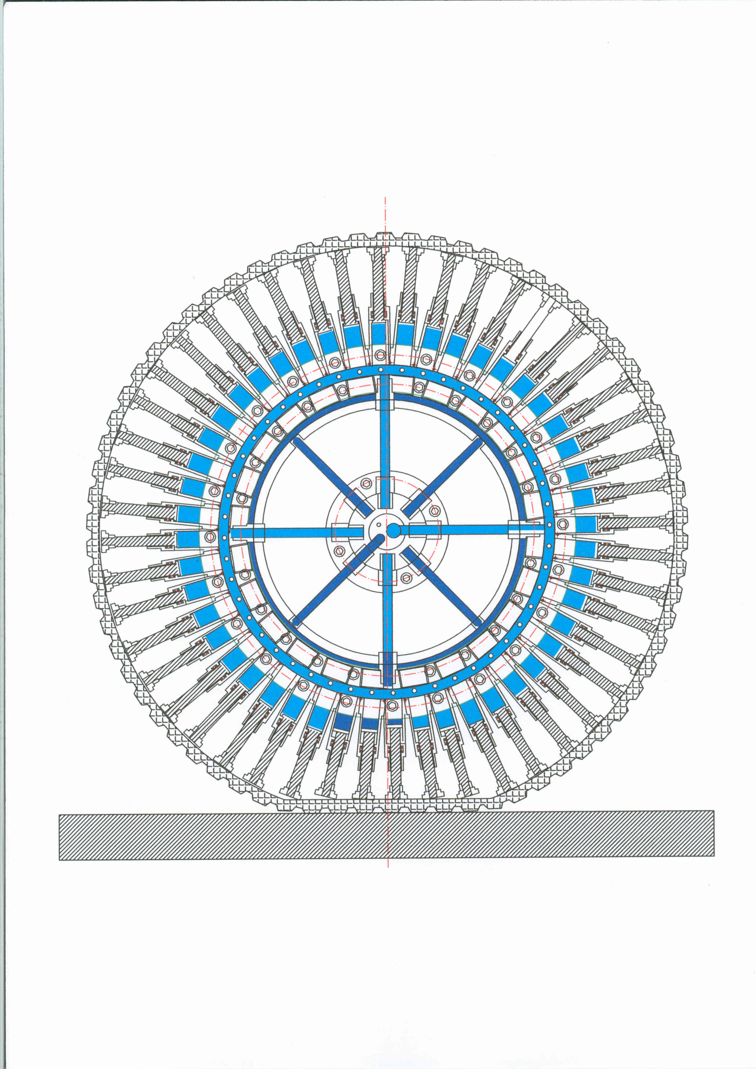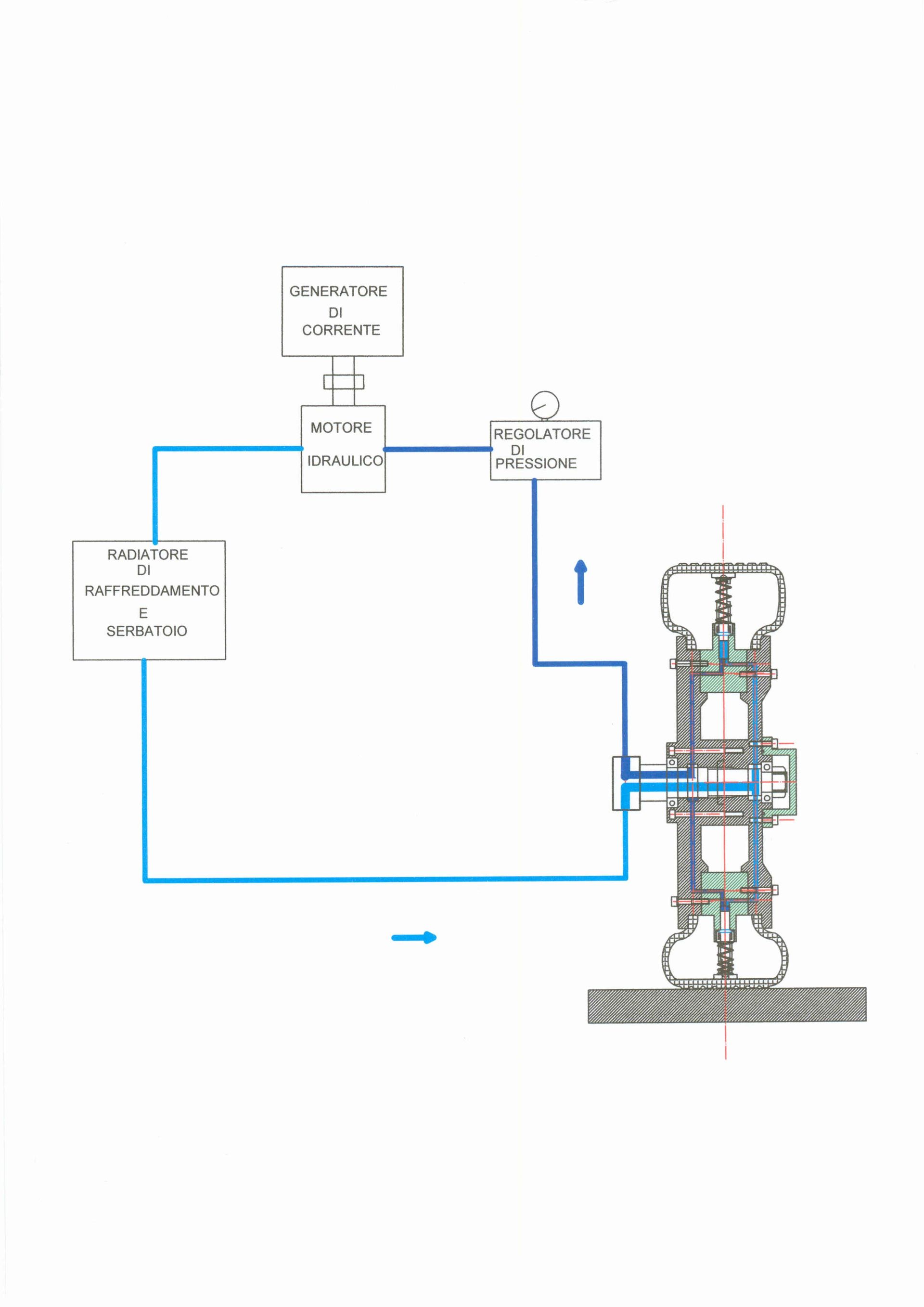 comprimiamo i pistoni all'interno del pneumatico stesso, i quali passando dal mozzo appositamente scanalato inviano un flusso continuo in grado di far girare un motore idraulico con solo 5/6 bar di pressione,